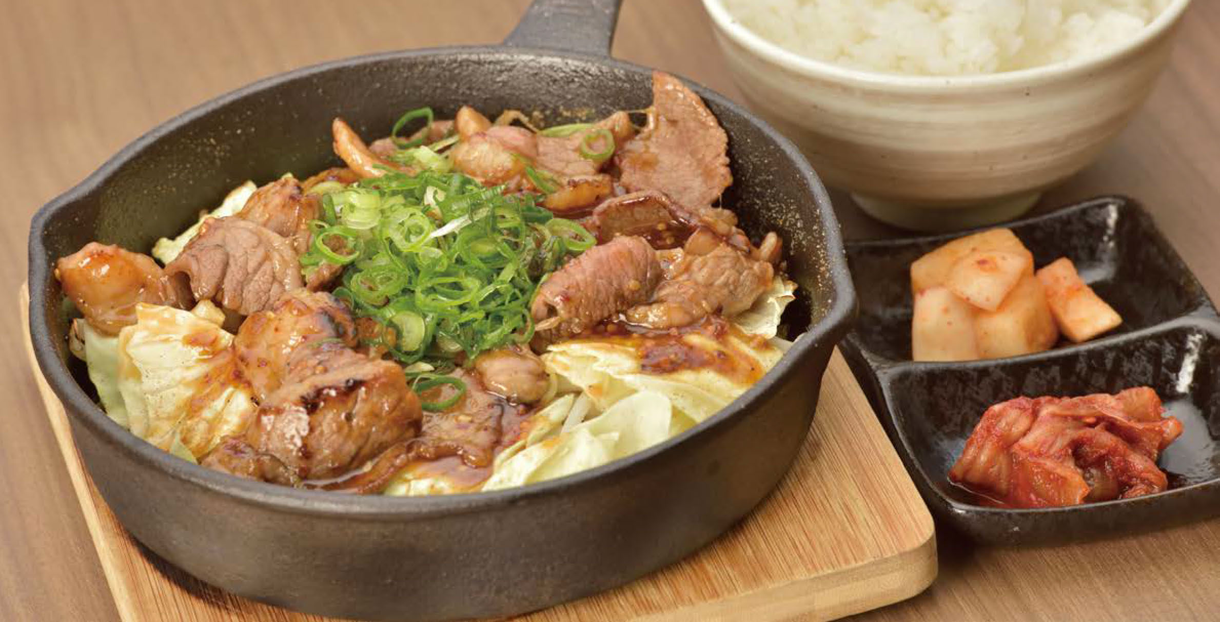 厳選した国産牛バラ肉をこんがりと焼き上げ、肉のうまみとたれがしみた野菜を あつあつ鉄板で食べる食欲そそる焼肉定食をお楽しみください。