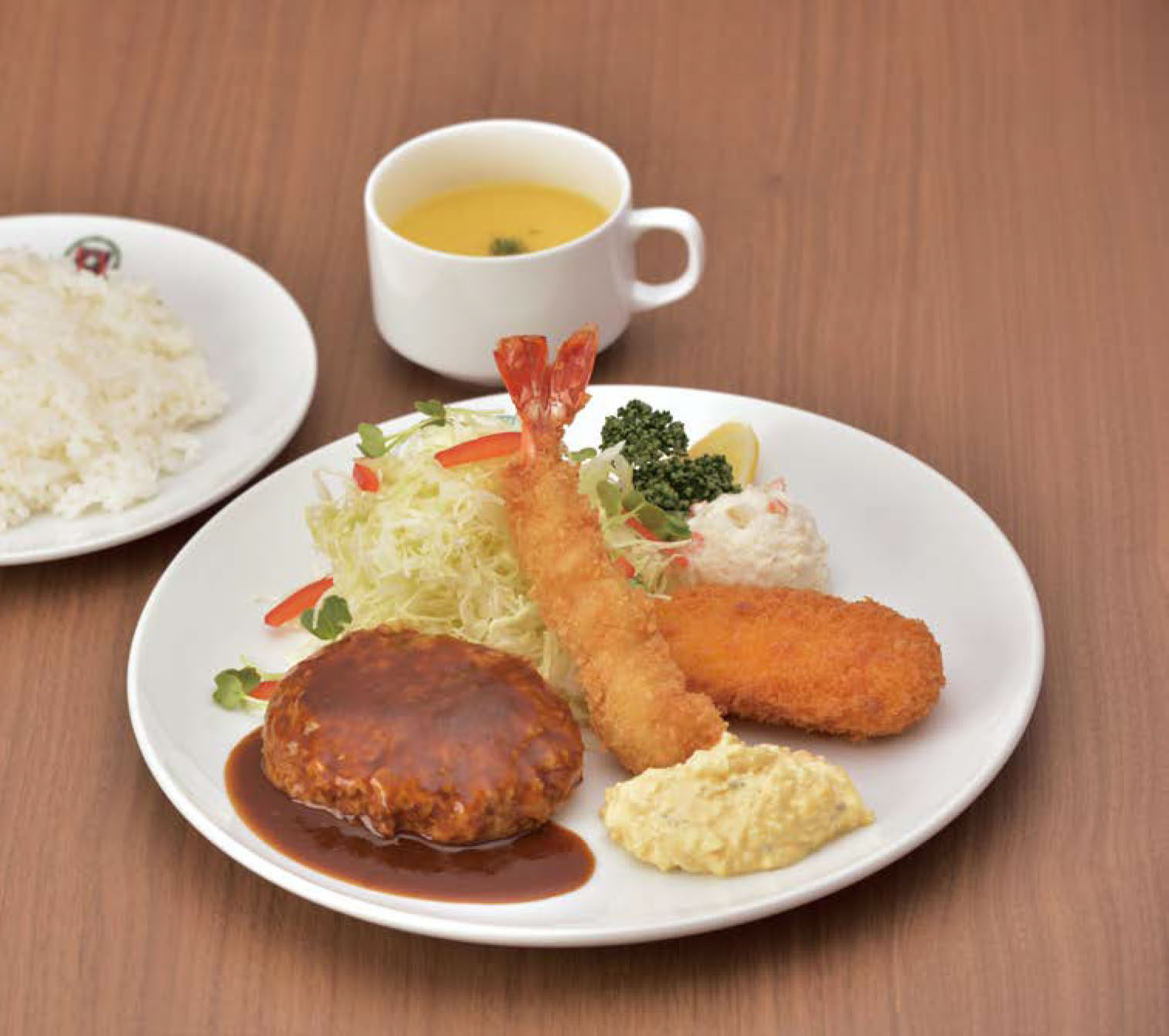 自家製ハンバーグ・海老フライ・蟹クリームコロッケ/ライス/コーンスープ 付