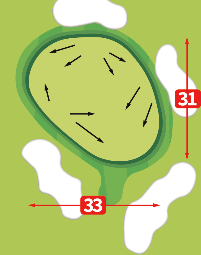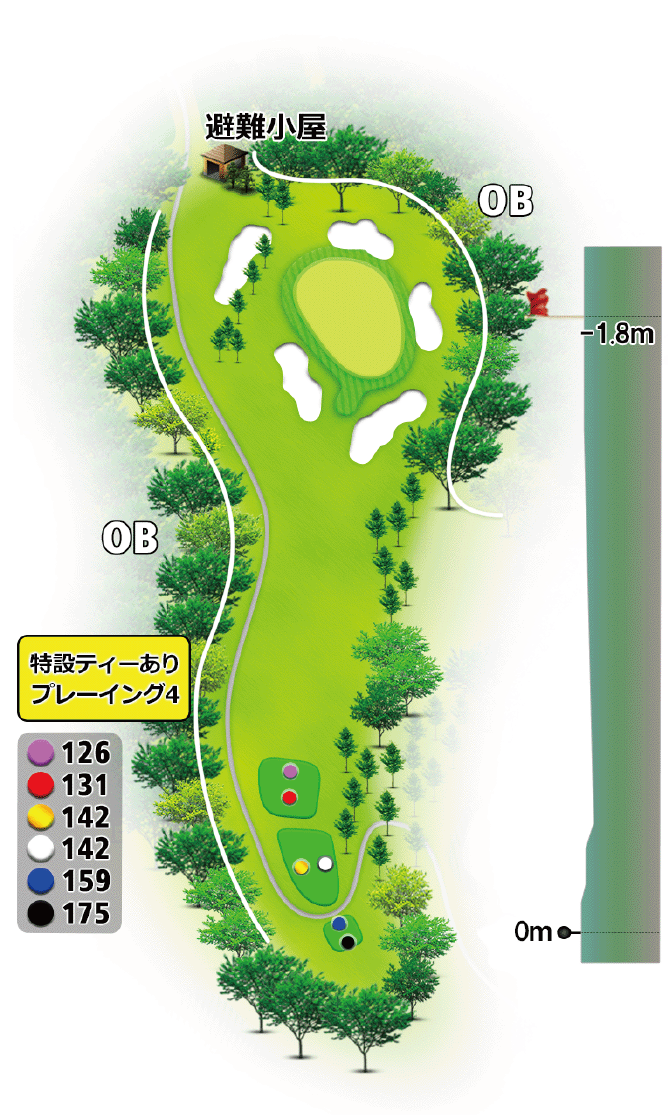 グリーンは5つのバンカーに囲まれており、距離感と方向性が求められるショートホール。グリーン左、奥は禁物。
