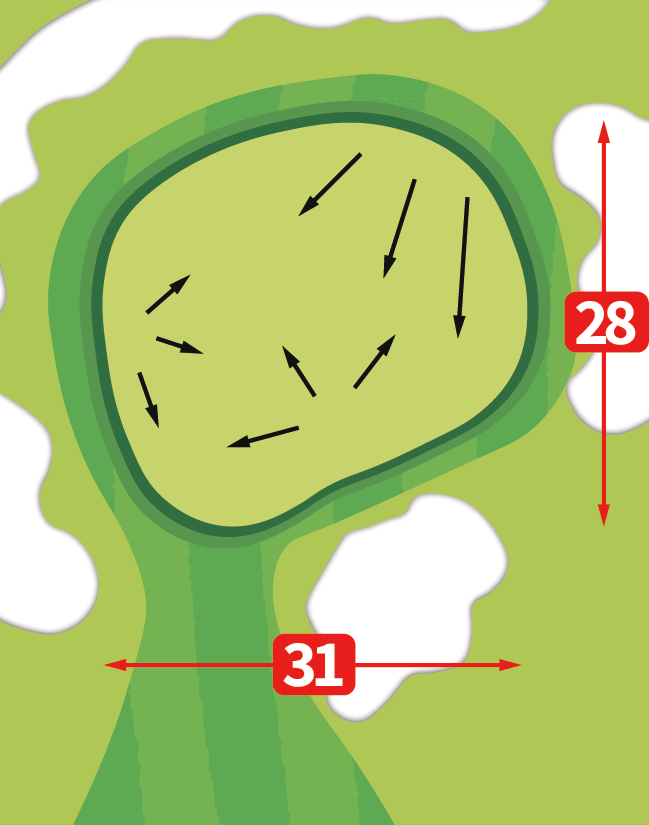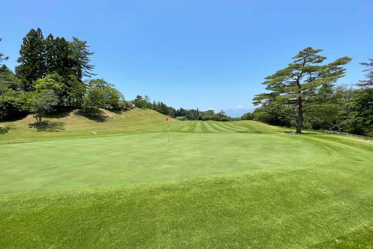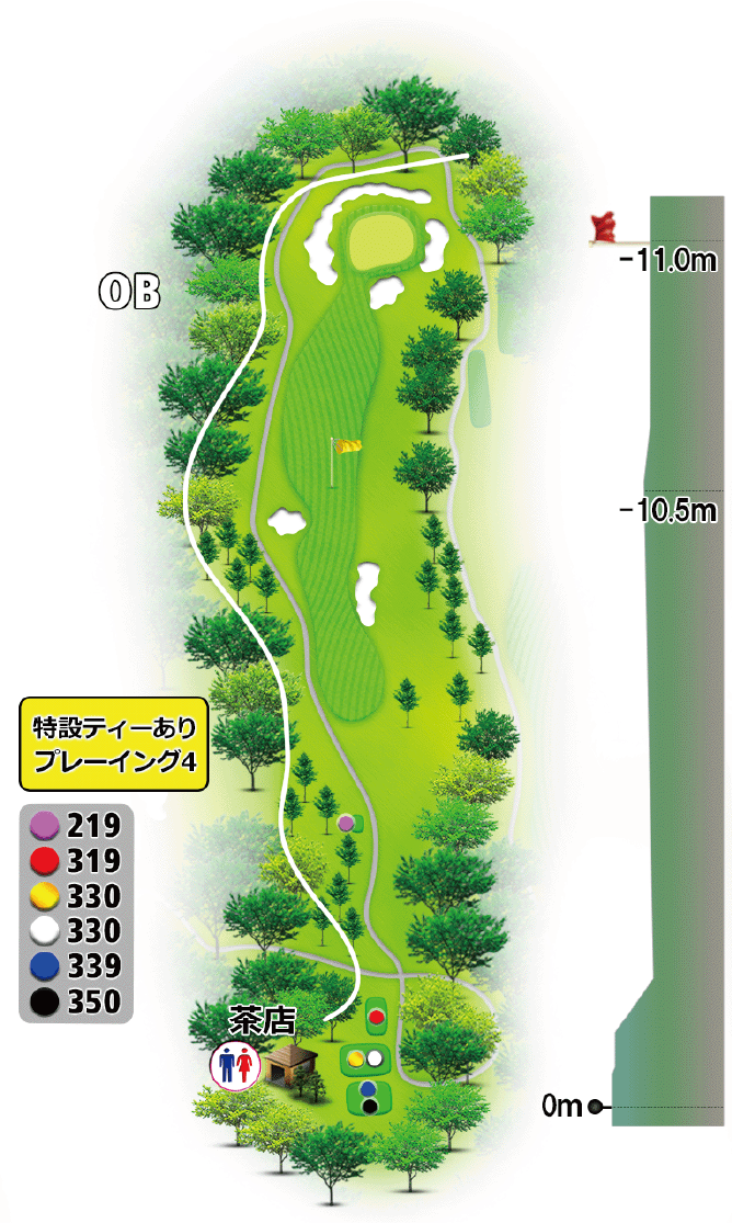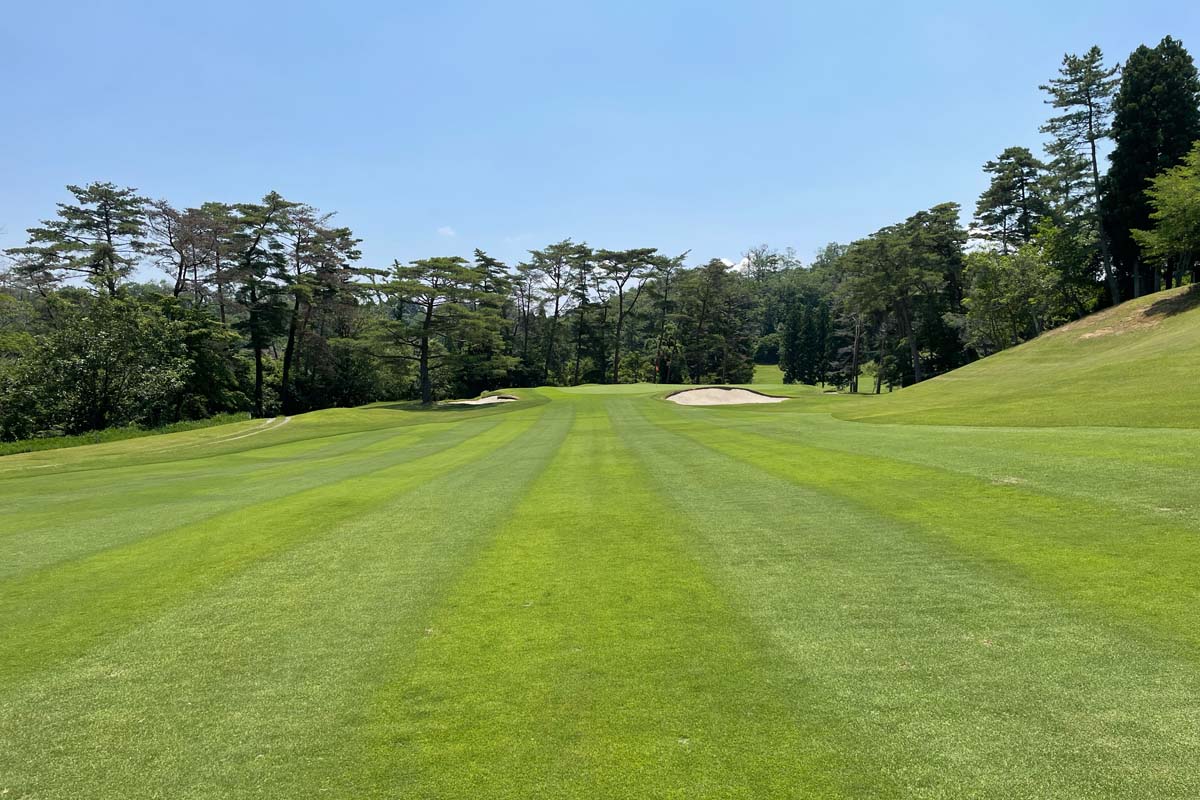 距離の短い、ストレートなミドルホール。ティーショットは、左右バンカーの間が狙い目。ロングヒッターなら右のバンカー超え狙いでも。グリーンオーバーは禁物。