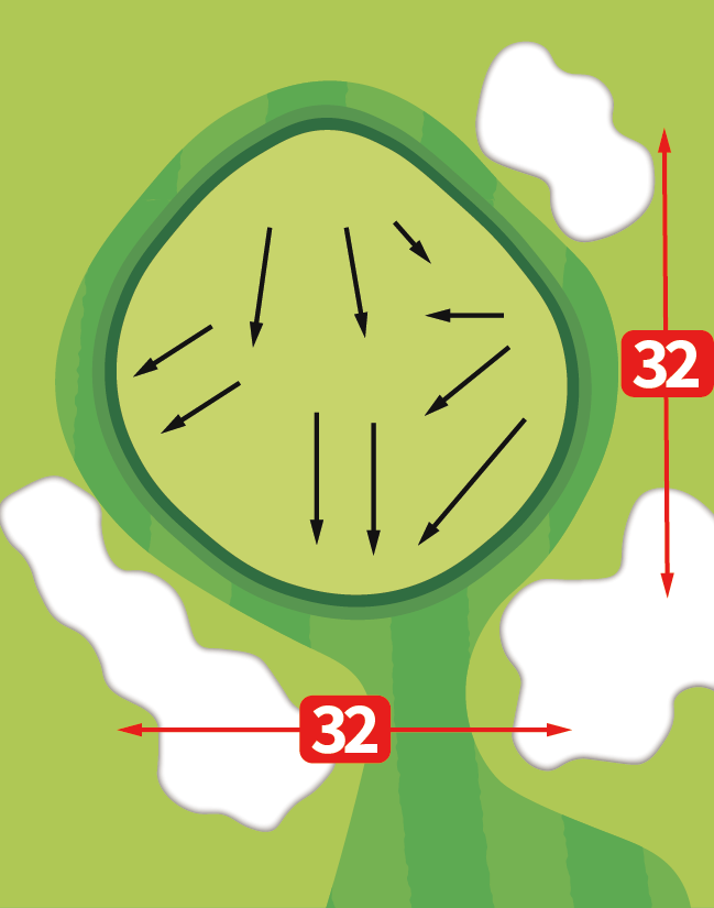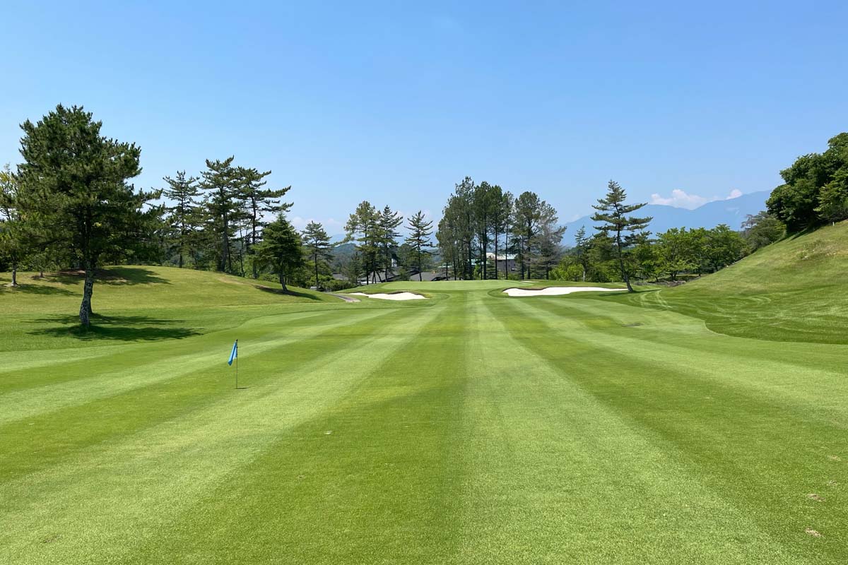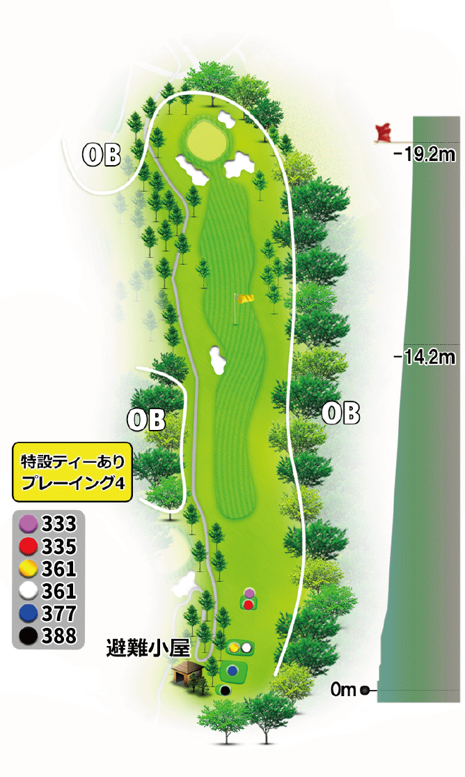 打ち下ろしで、ほぼストレートなミドルホール。ティーショットは、奥に見えるクラブハウスの煙突方向が狙い目。スライスはOBの危険大。