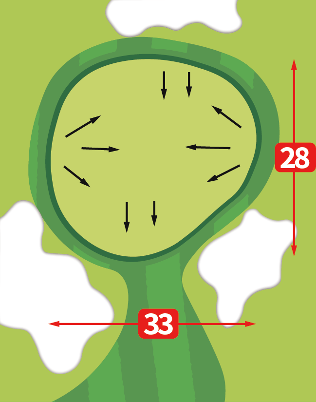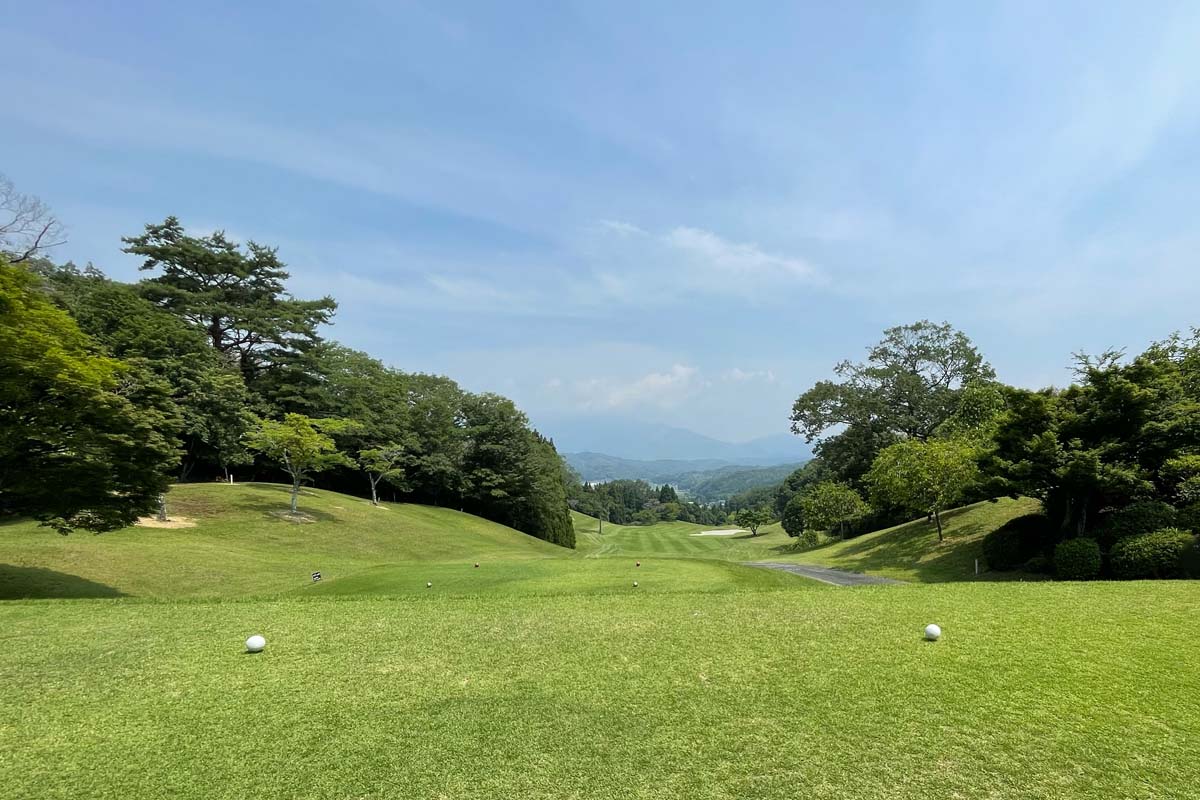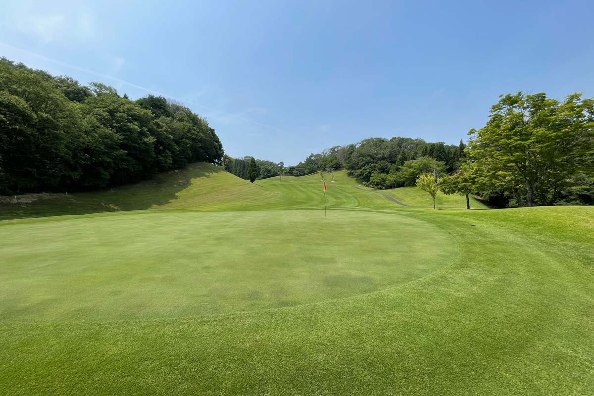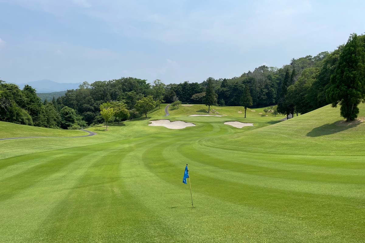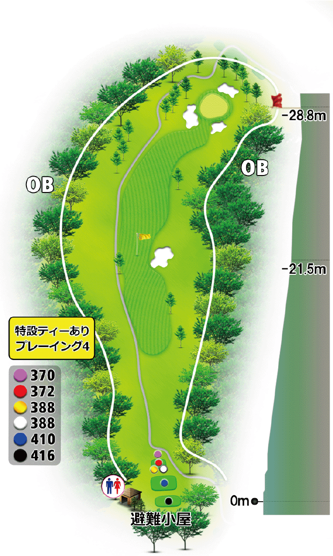 打ち下ろしで右ドッグレッグのミドルホール。ティーショットは、右のクロスバンカーを避け、左目に。
