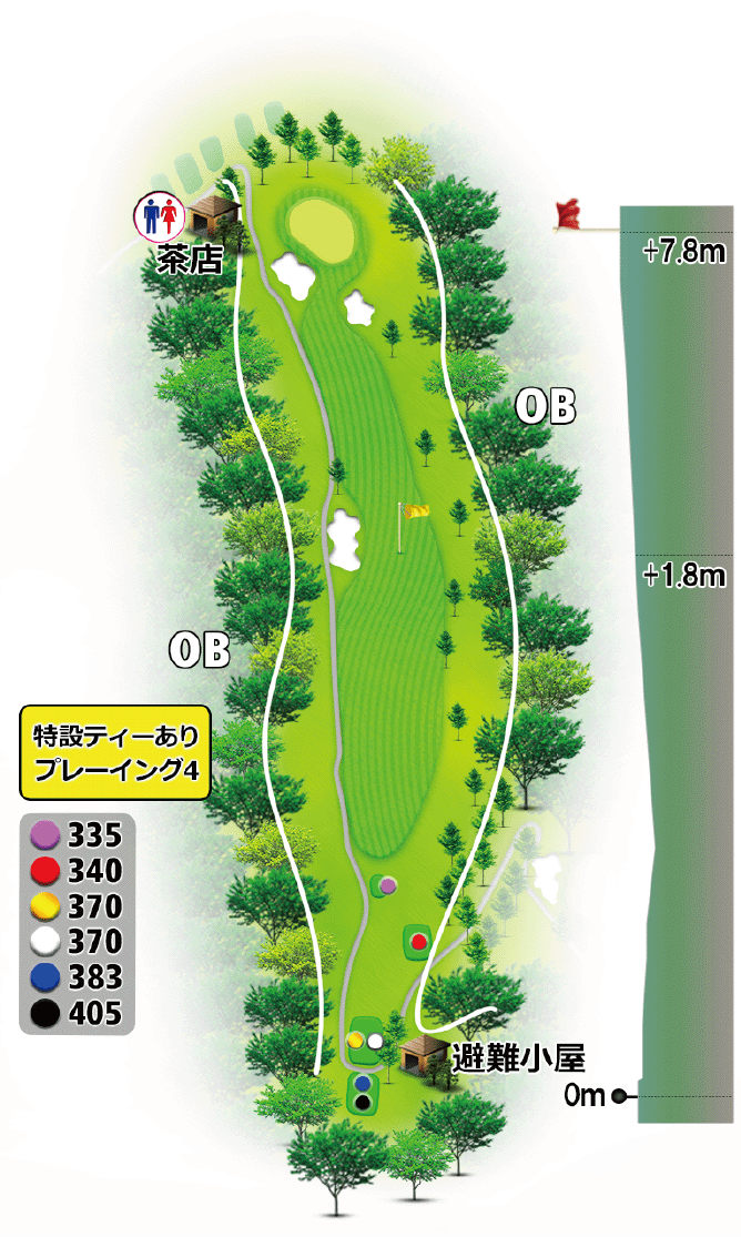 やや左ドッグレッグの距離の長いミドルホール。ティーショットは、センターからやや右側が狙い目。