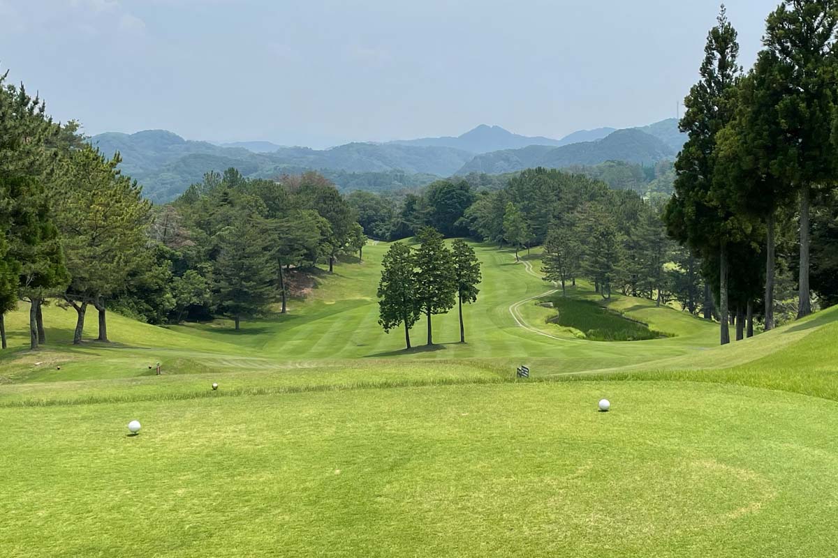 打ち下ろしのロングホール。左に行くとセカンドで山越えになり、右は池がある為、ティーショットは3本の檜の中央が狙い目。