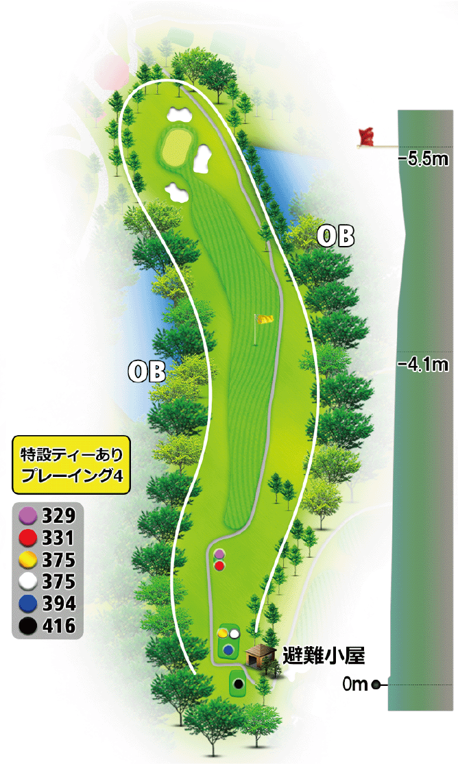左ドッグレッグのミドルホール。ティーショットは、センターからやや右側が狙い目。