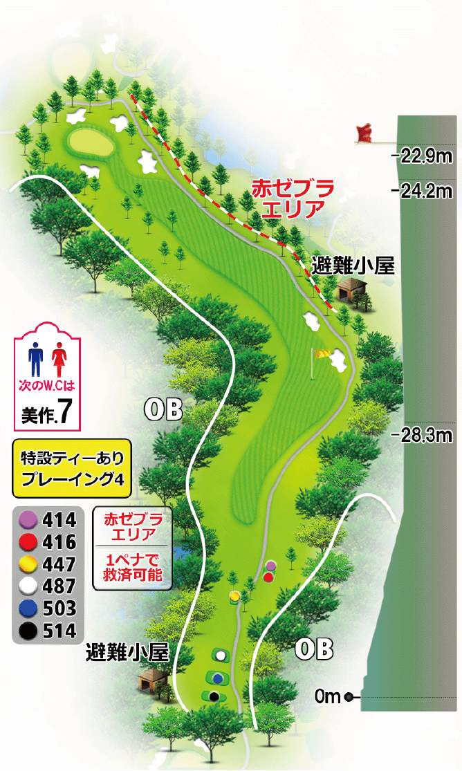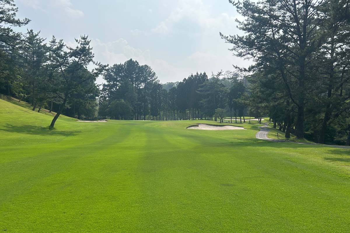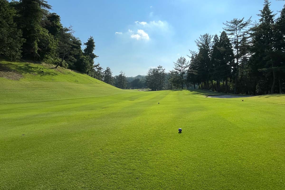 美作コースは名物、きつい左ドッグレッグのブラインドホール。ティーショットは、正面のバンカーとバンカーの間へ。ロングヒッターは、左側山裾が狙い目。