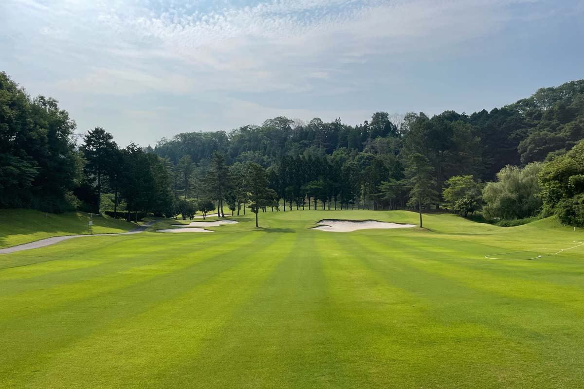 打ち下ろしのミドルホール。ティーショットは、正面の山に見えるガイドポールの左方向が狙い目。