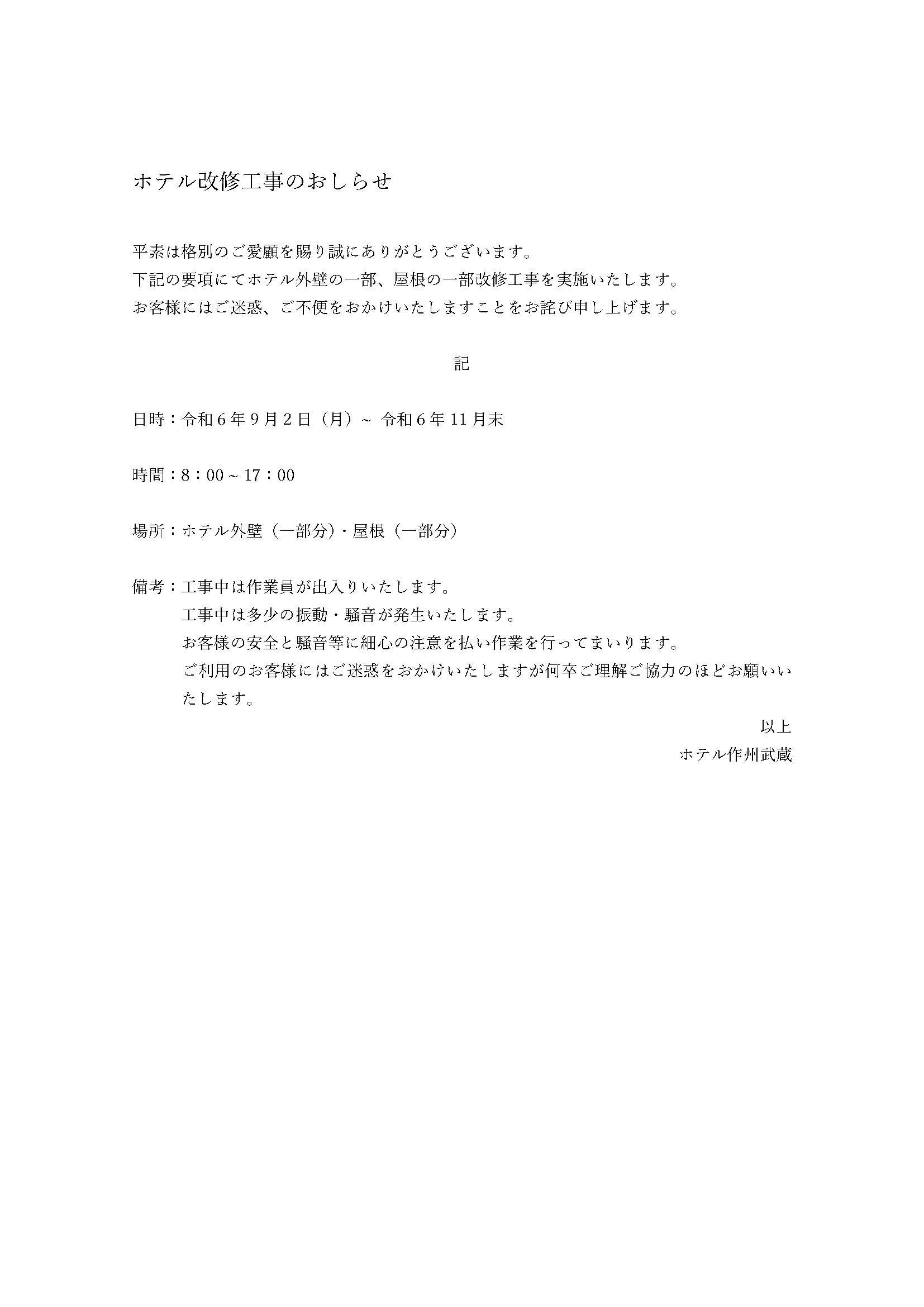 ホテル改修工事のおしらせ