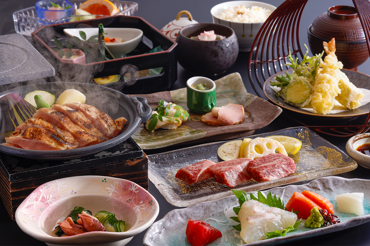 鯛のアクアパッツァ風や桜蒸しなど、伝統とモダンが融合した春の会席。山菜の天婦羅や黒毛和牛の溶岩焼きと共に、春の情景をお皿の上に表現しました。大切な方との春のお食事にどうぞ。