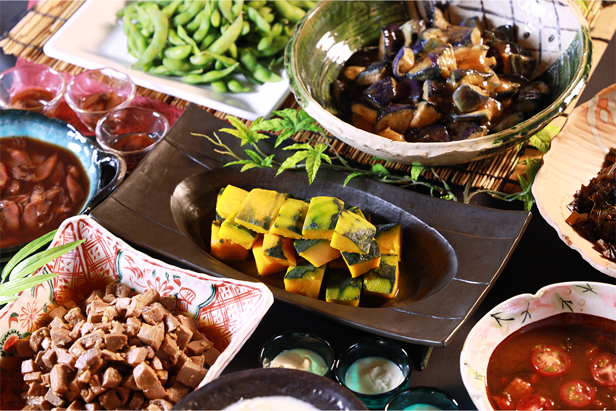 季節の和食膳に加えて8種類のおばんざいをお楽しみください。本館4階宴会場でご用意しております。